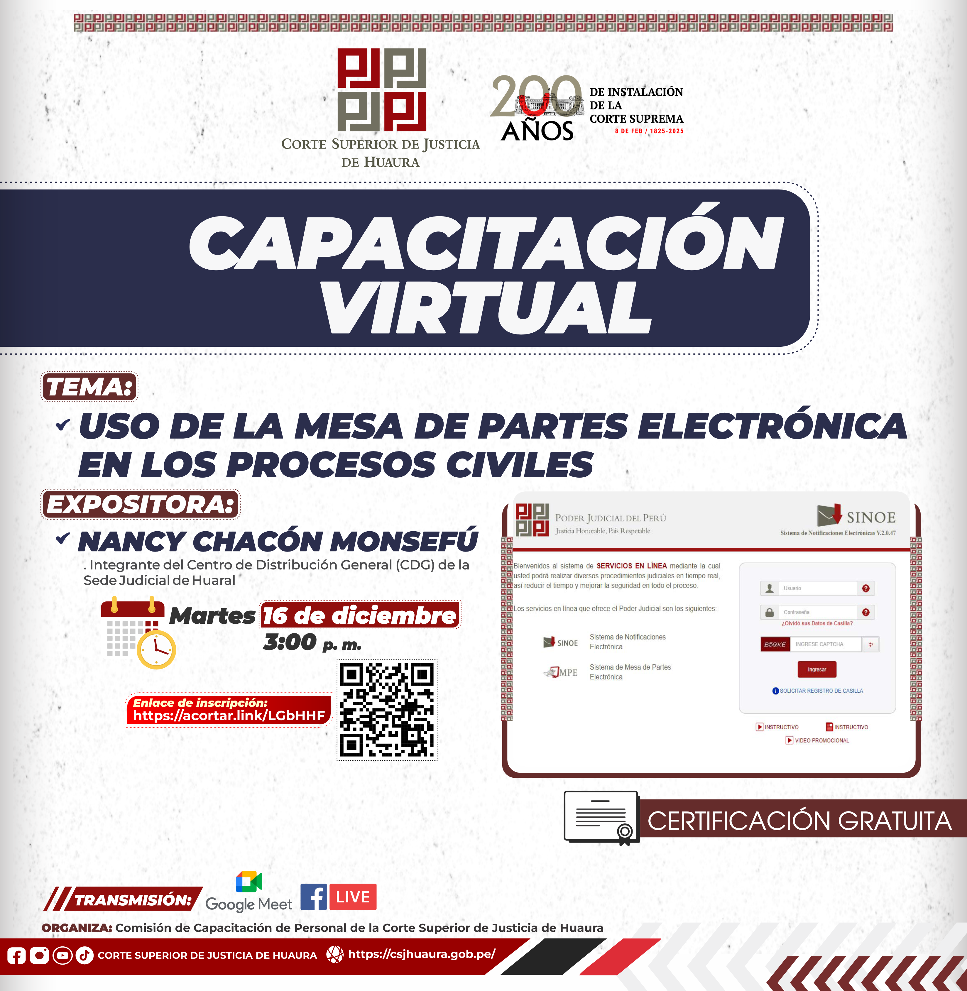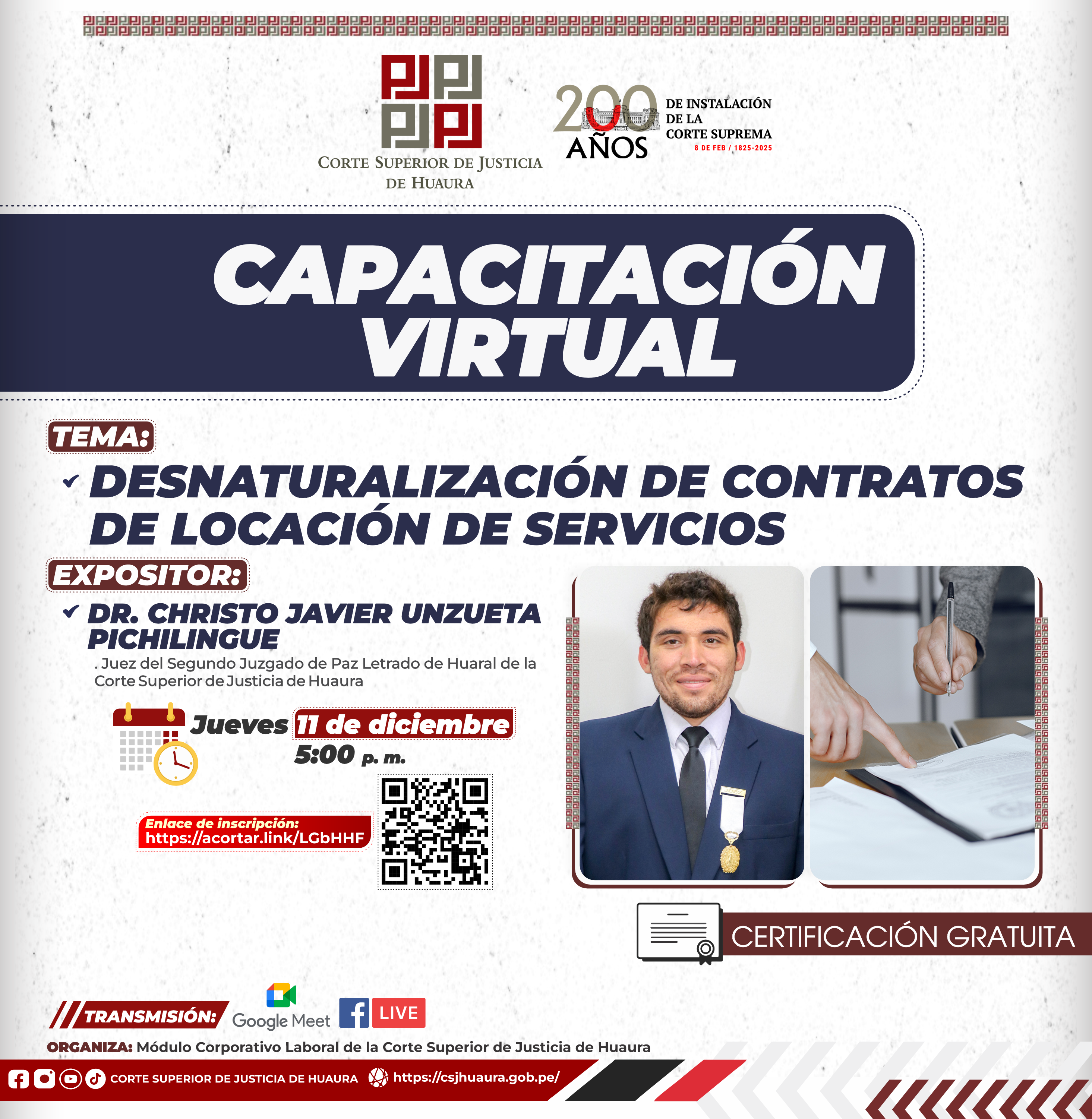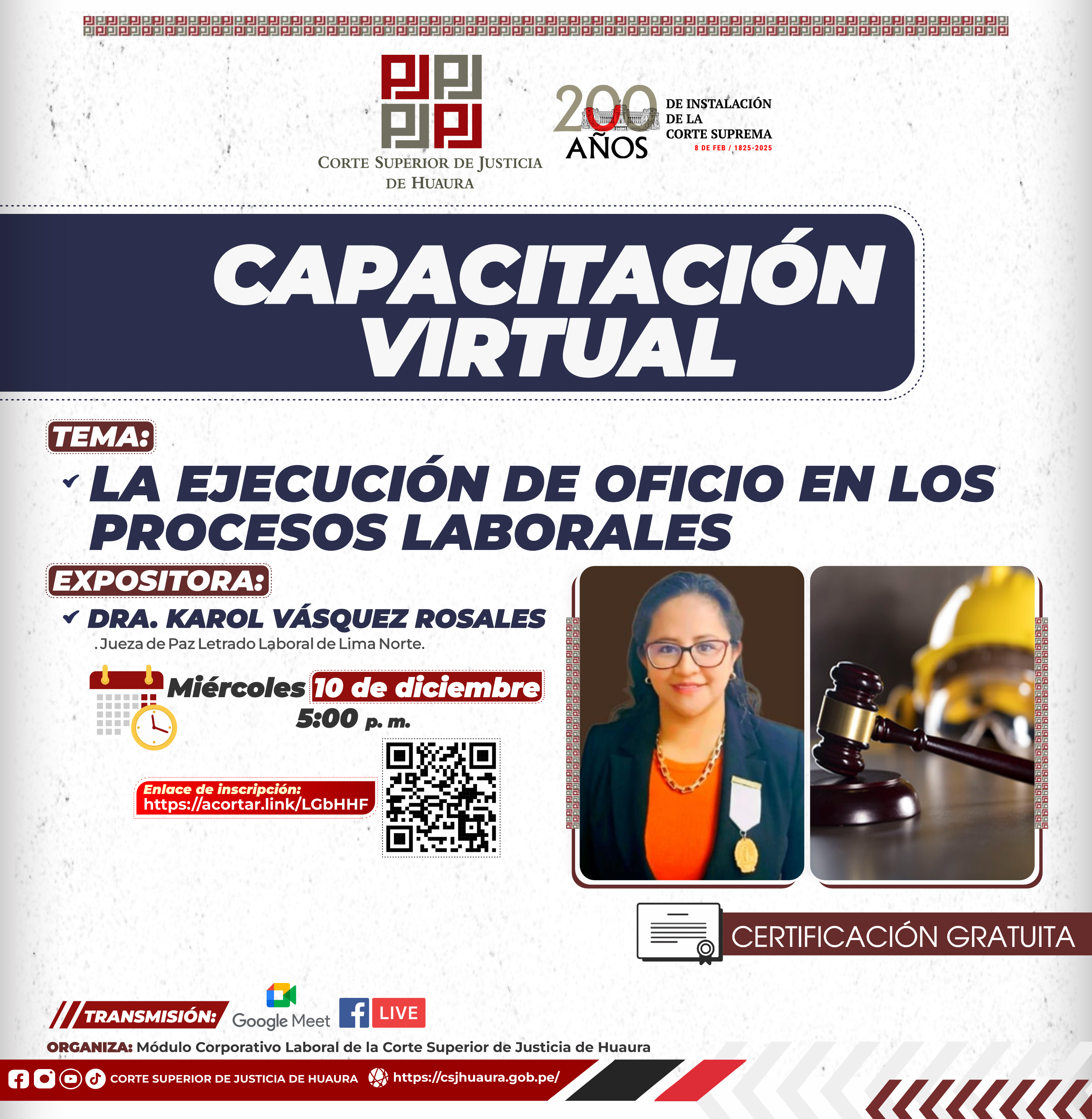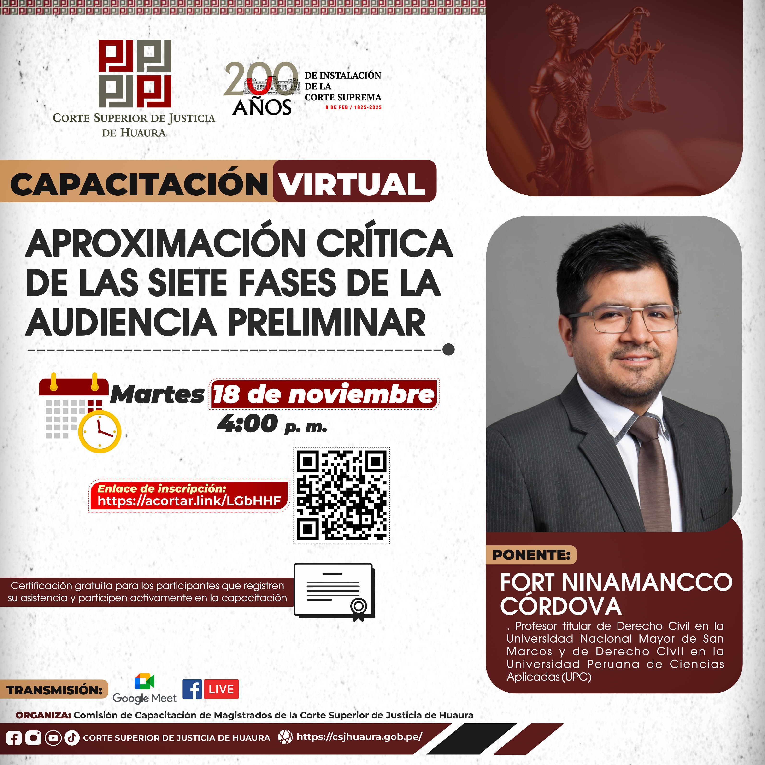 Evento Académico Virtual : Dirigido a magistrados, servidores jurisdiccionales, administrativos de la Corte de Huaura, abogados y público en general.