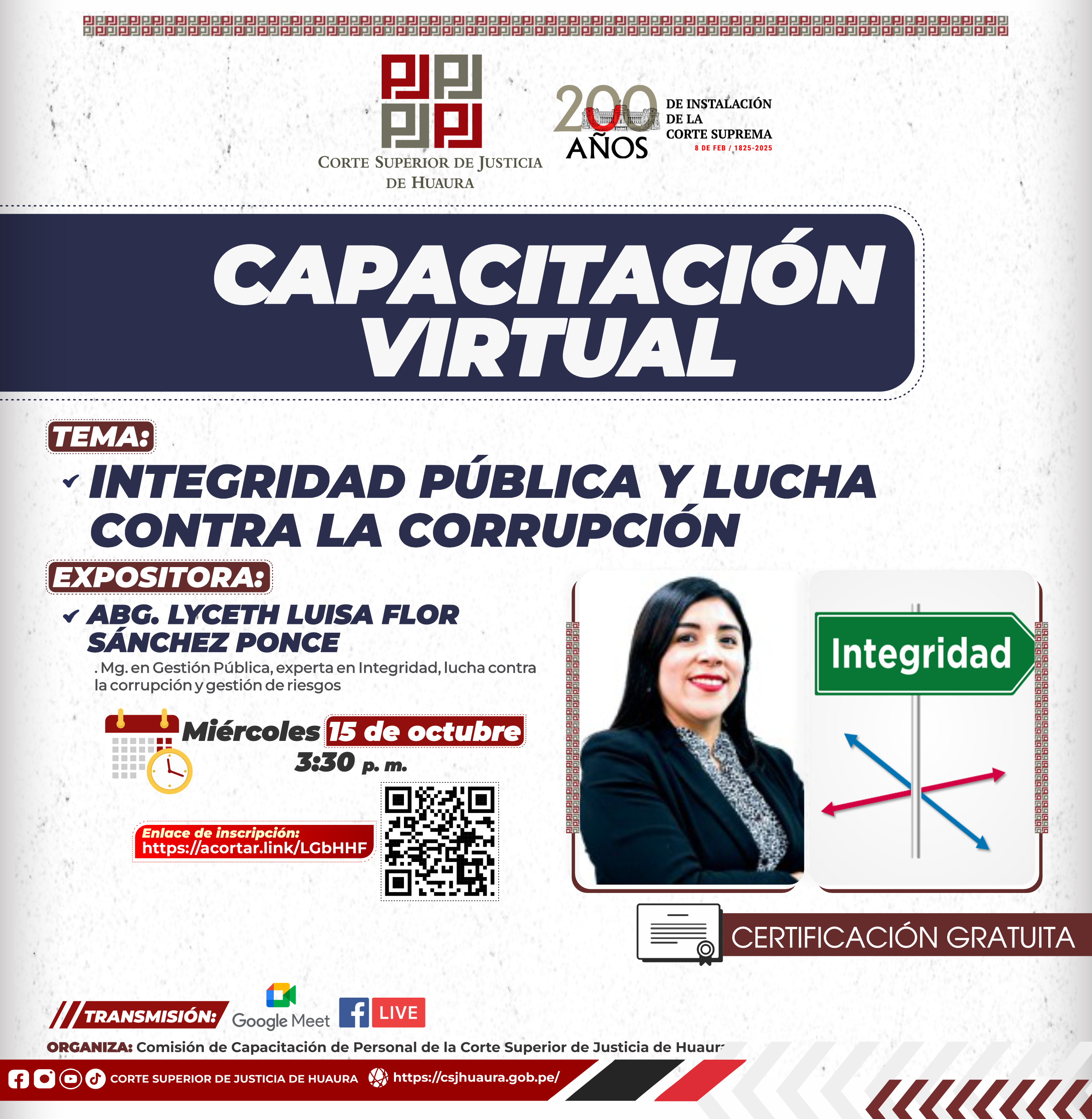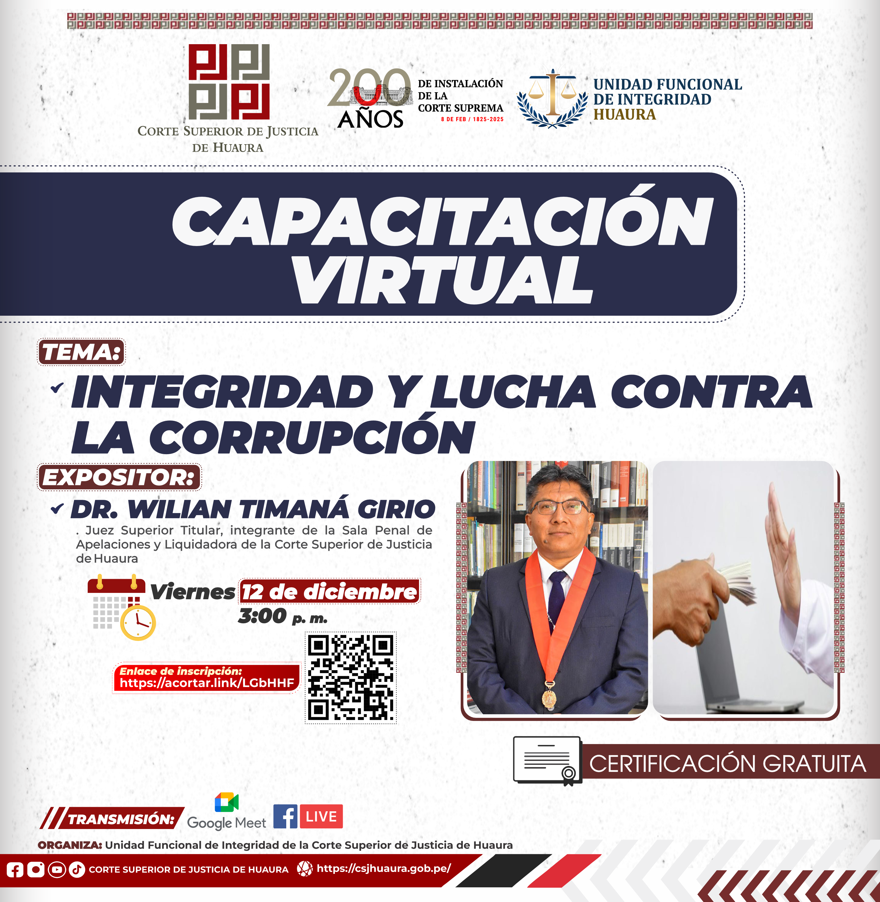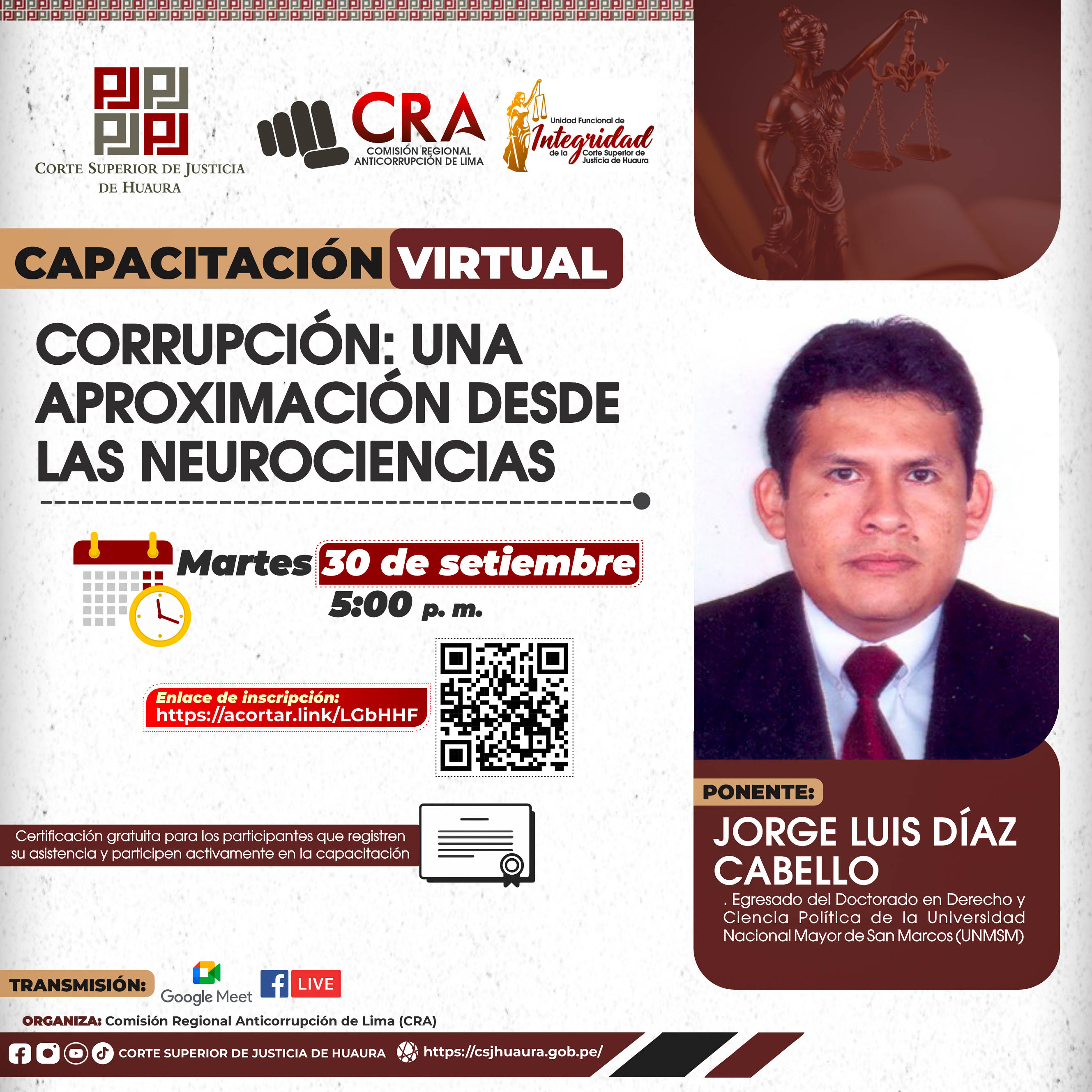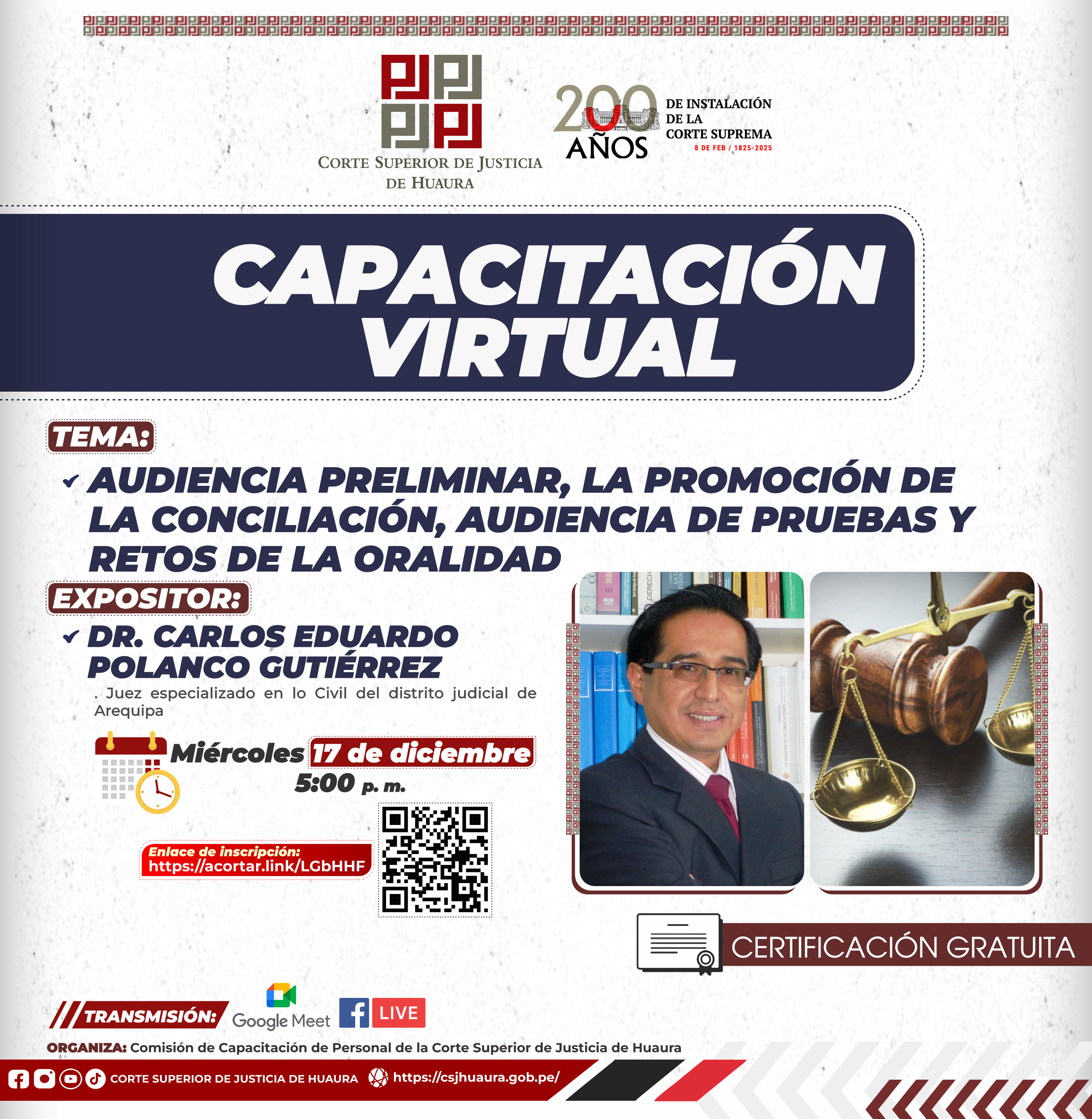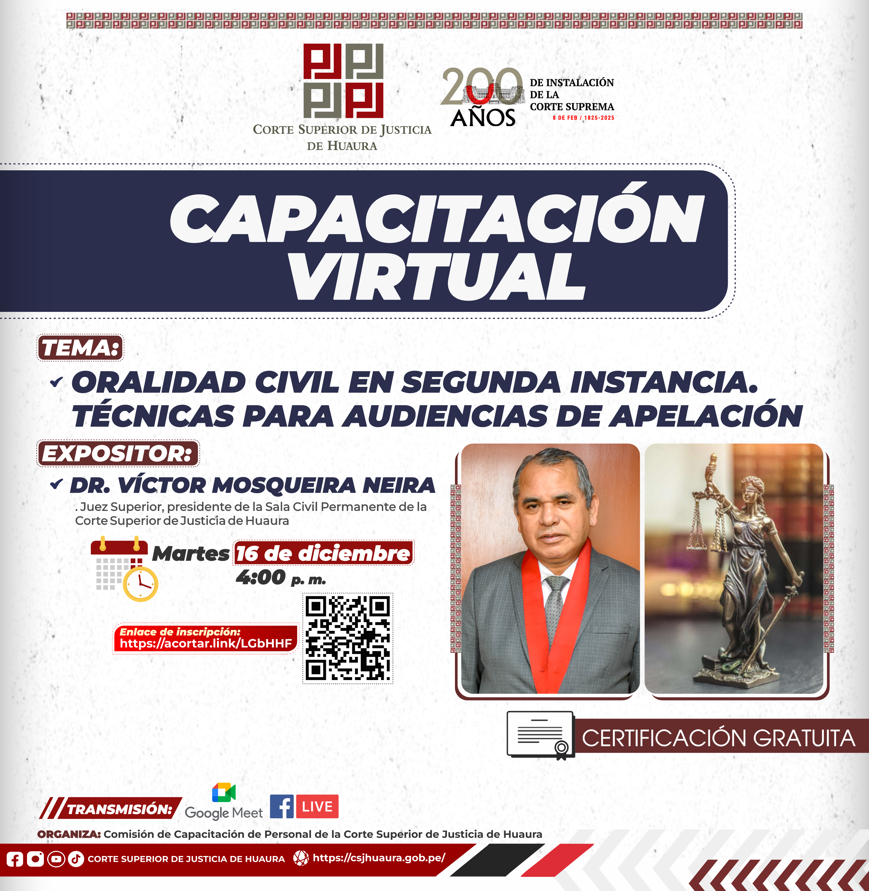 Evento Académico Virtual : Dirigido a magistrados, servidores jurisdiccionales, administrativos de la Corte de Huaura, abogados y público en general.