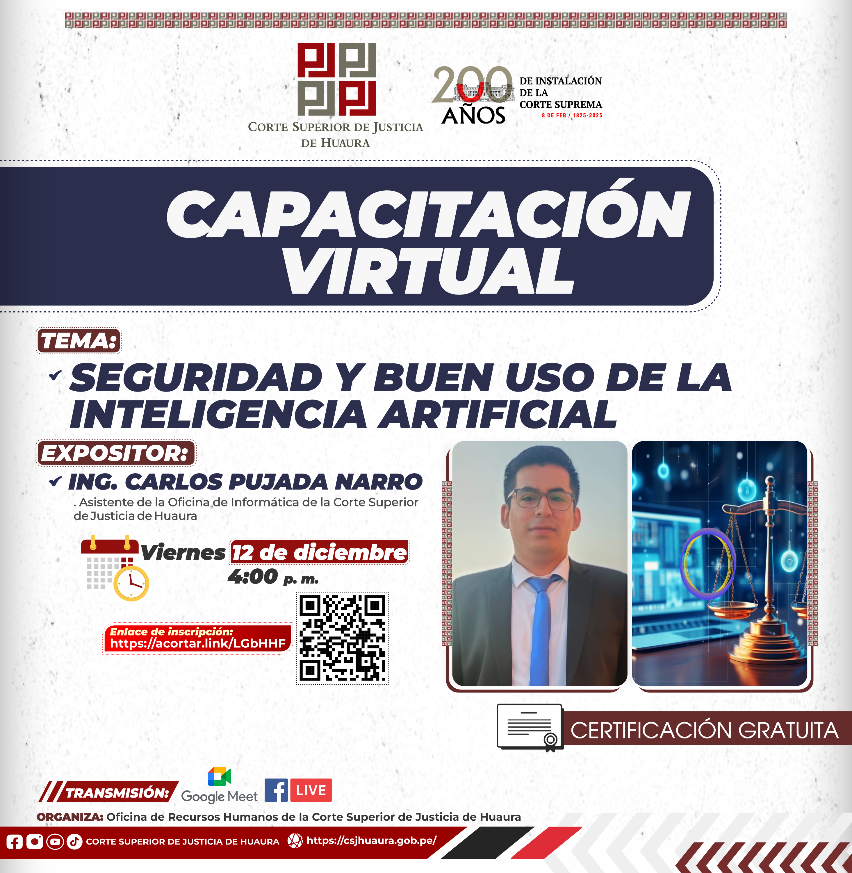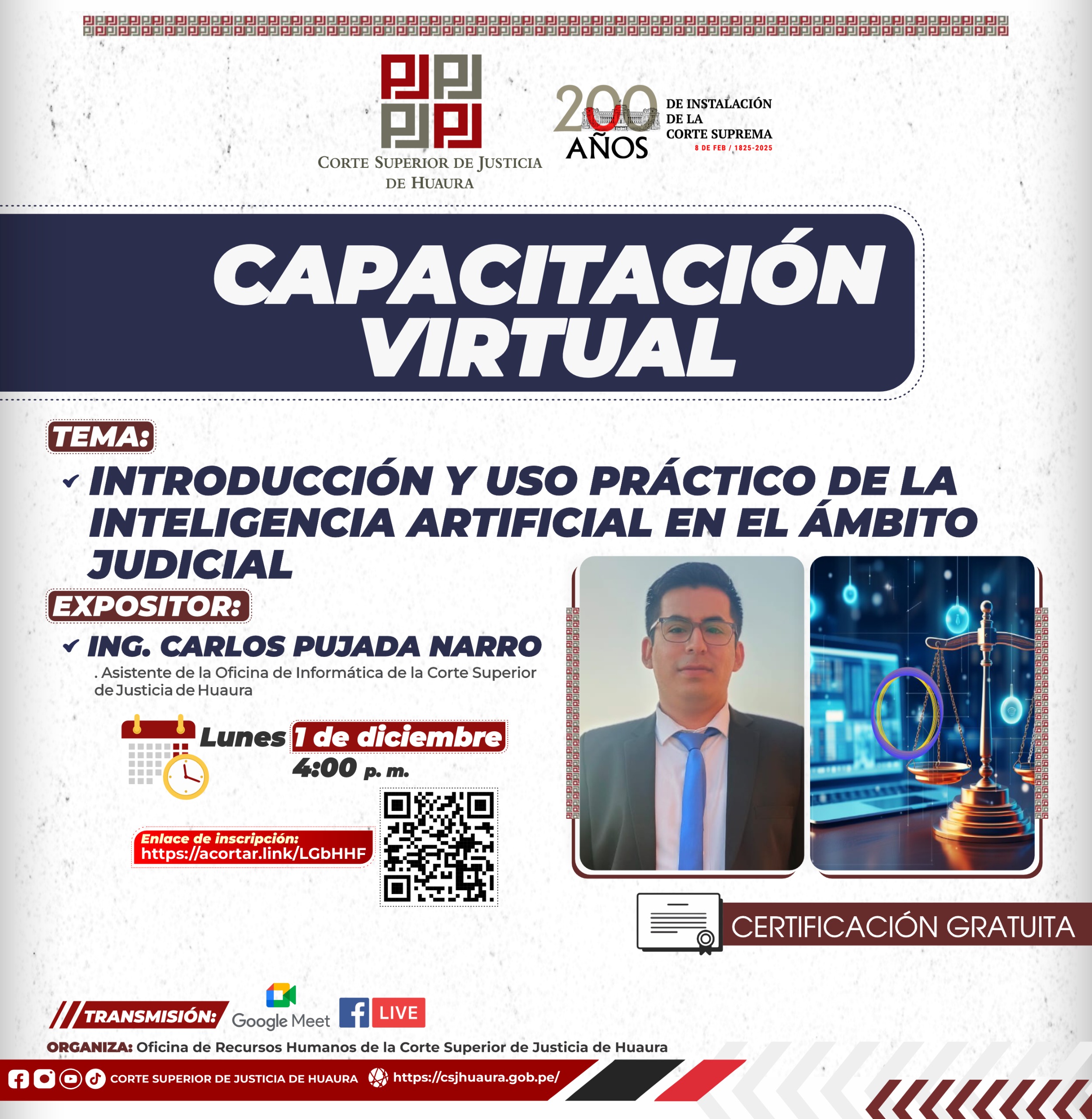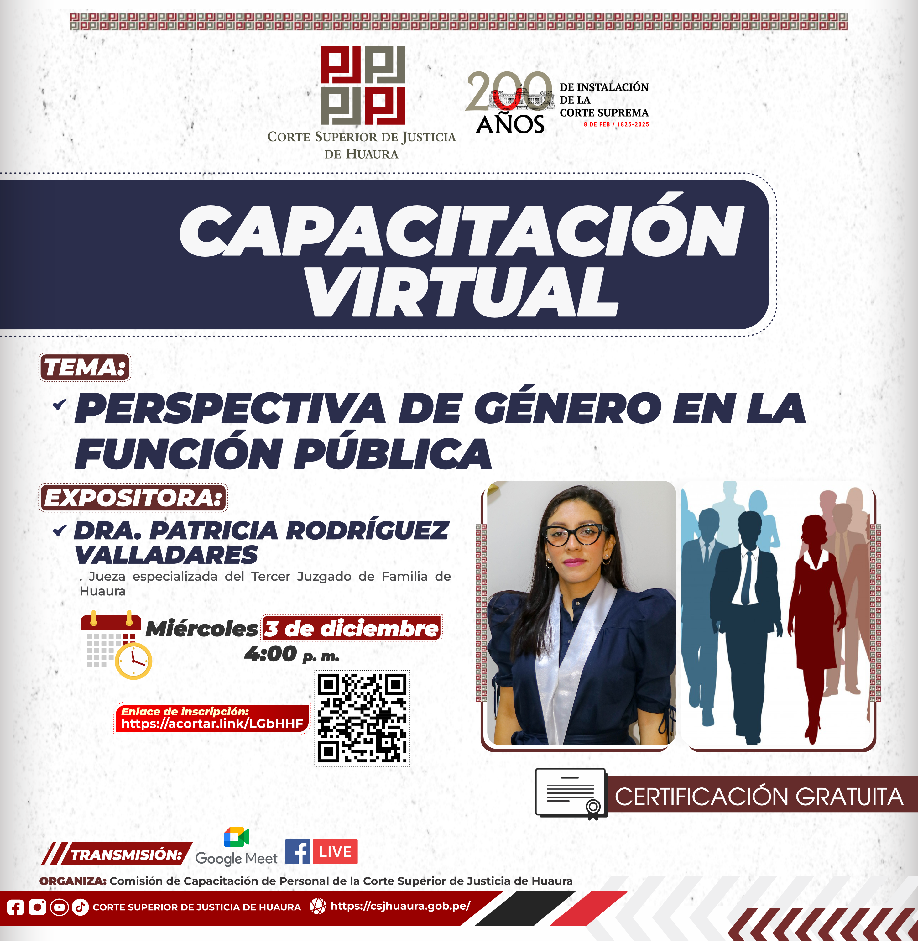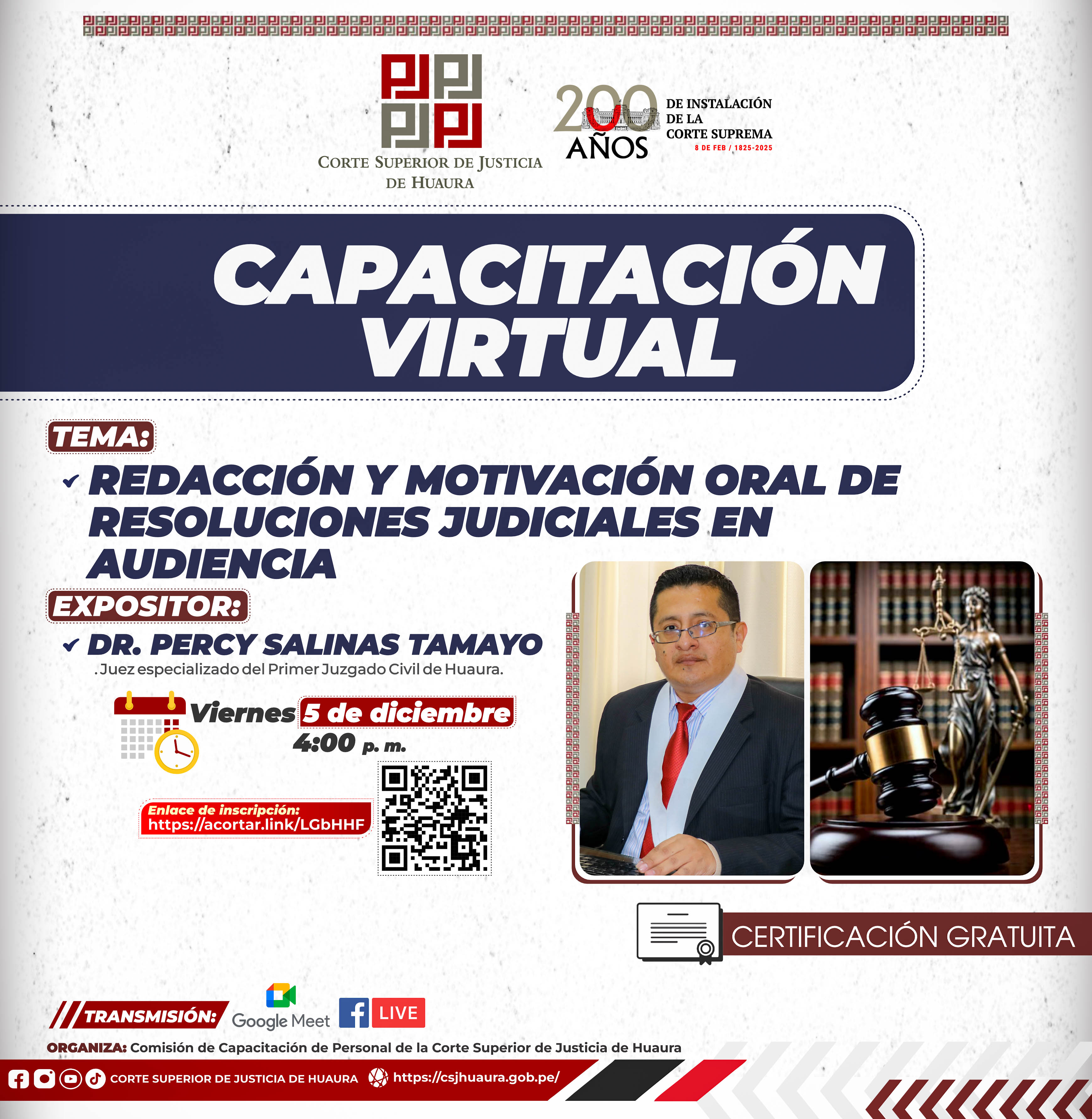 Evento Académico Virtual : Dirigido a magistrados, servidores jurisdiccionales, administrativos de la Corte de Huaura, abogados y público en general.