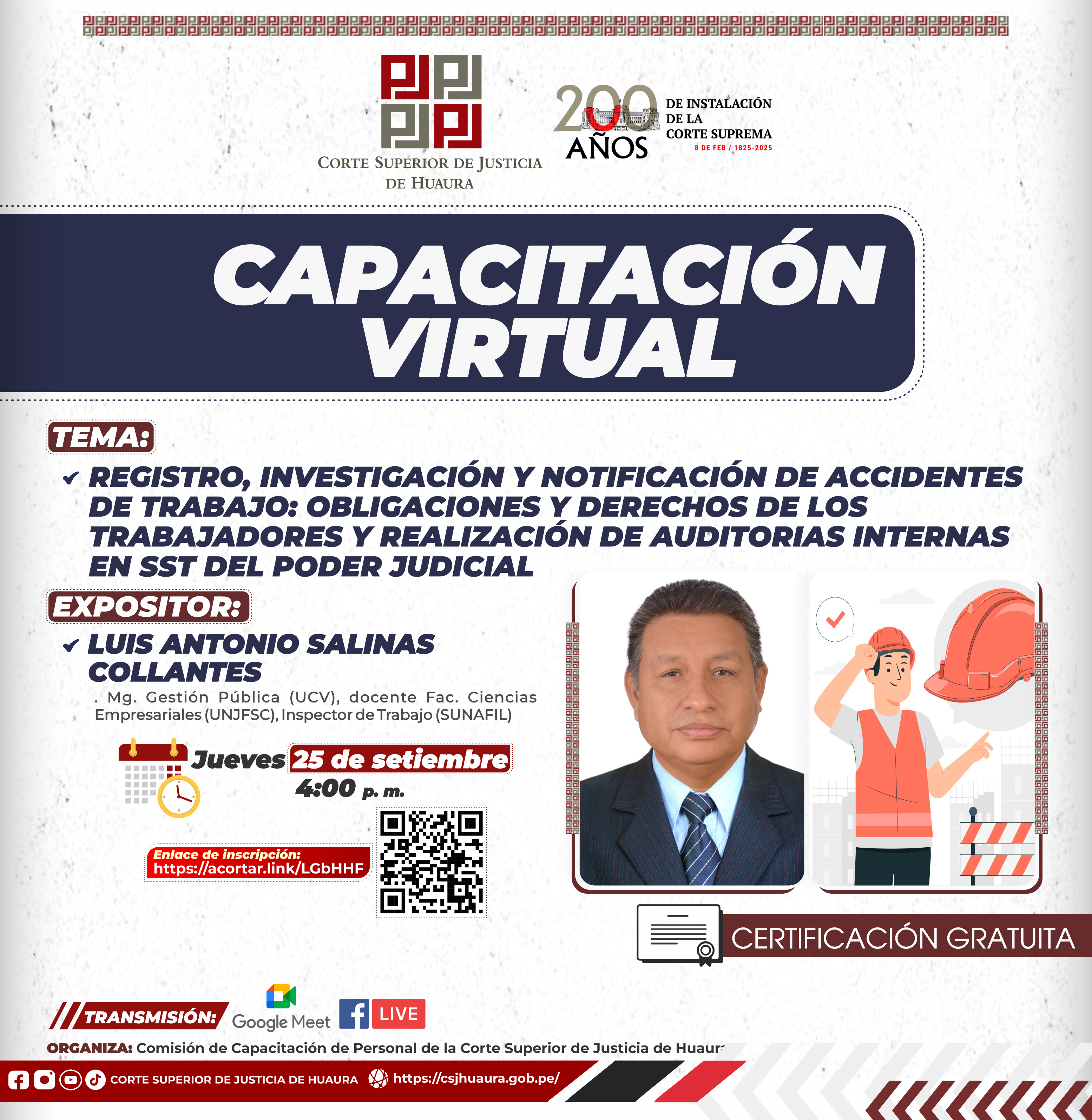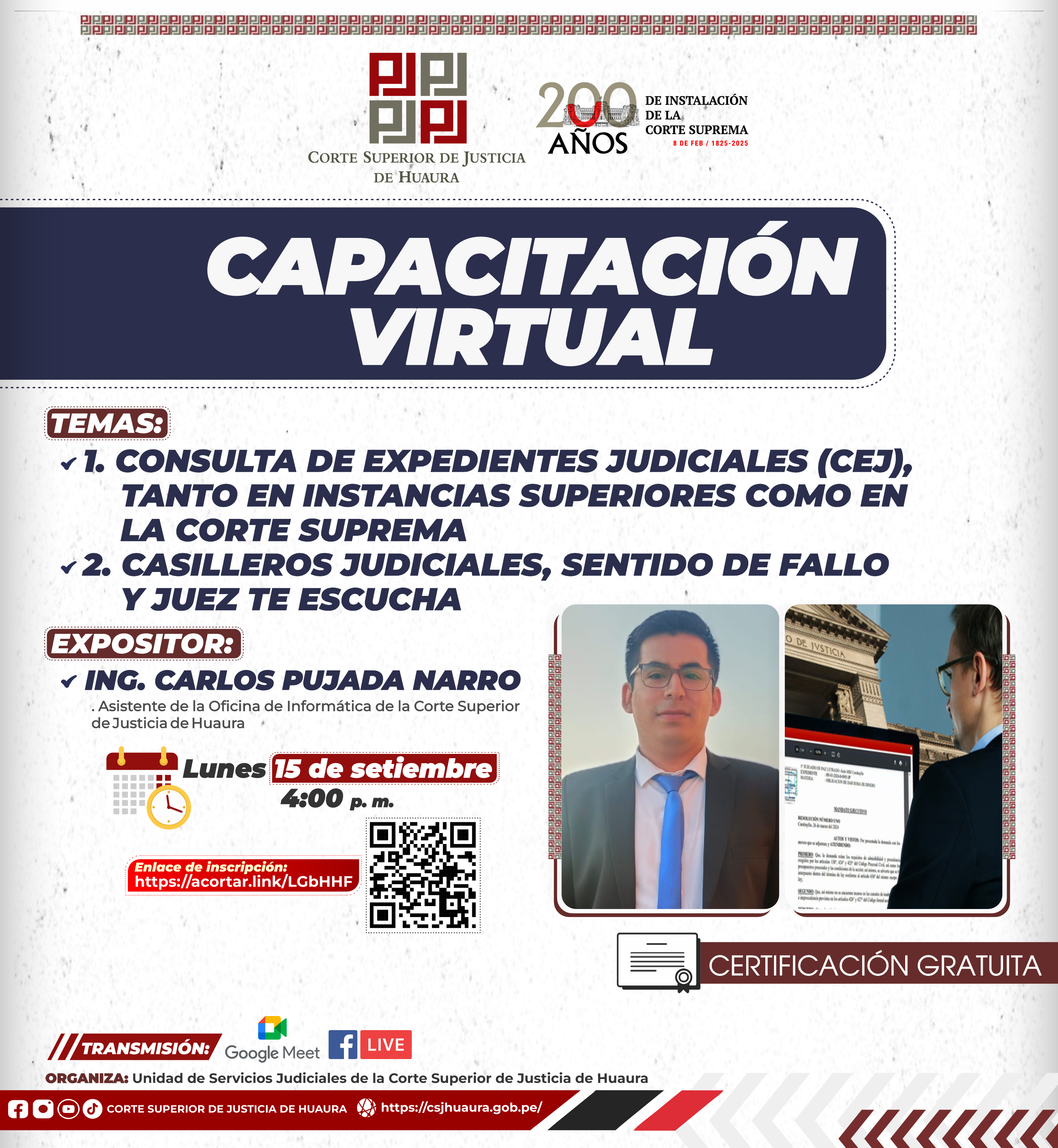 Evento Académico Virtual : Dirigido a magistrados, servidores jurisdiccionales, administrativos de la Corte de Huaura, abogados y público en general.