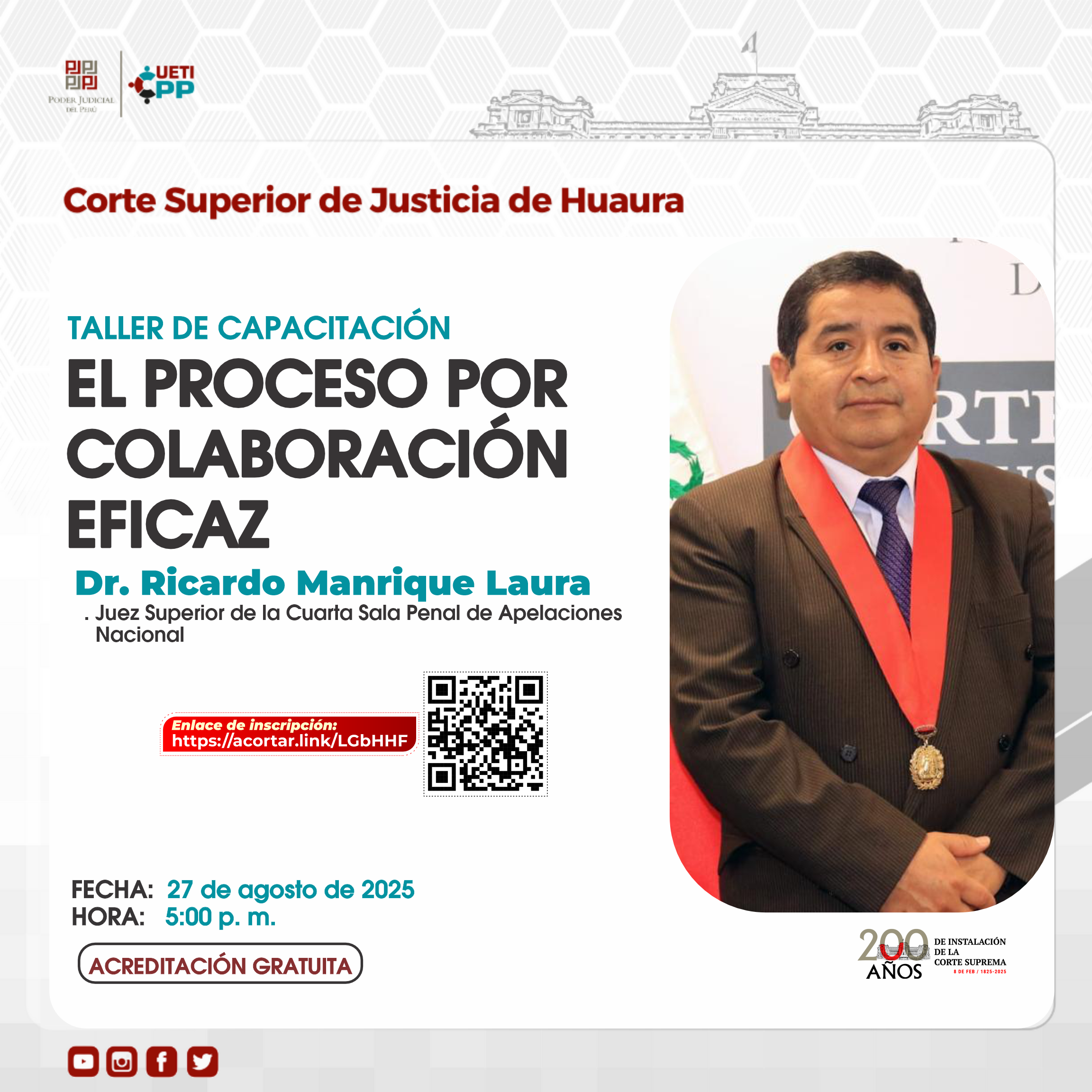 Evento Académico Virtual: Dirigido a Magistrados, servidores jurisdiccionales, administrativos de la Corte Superior de Justicia de Huaura, abogados y público en general.